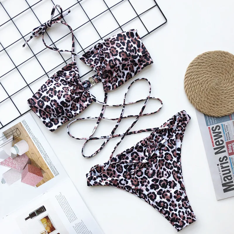 Leopard Swimsuit Snake Print Bikini 2020 Sexy Cross Bandage Bathing Suit Women Push Up Separate Bikini Set Halter Top SwimwearBuy Now On Aliexpress