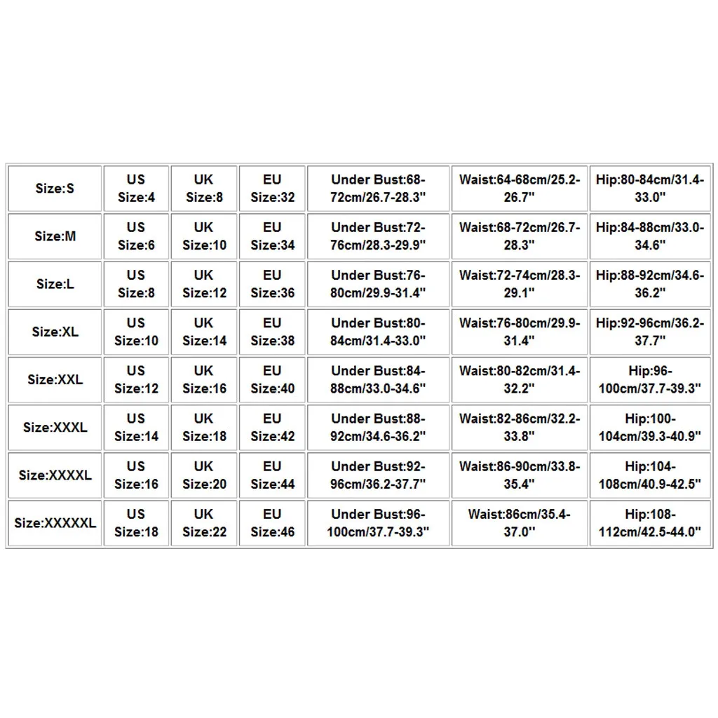 Size US Size UK Size EU Size Under Bust Waist Hip S 4 8 32 68-72cm/26.7-28.3" 64-68cm/25.2-26.7" 80-84cm/31.4-33.0" M 6 10 34 72-76cm/28.3-29.9" 68-72cm/26.7-28.3" 84-88cm/33.0-34.6" L 8 12 36 76-80cm/29.9-31.4" 72-74cm/28.3-29.1" 88-92cm/34.6-36.2" XL 10 14 38 80-84cm/31.4-33.0" 76-80cm/29.9-31.4" 92-96cm/36.2-37.7" XXL 12 16 40 84-88cm/33.0-34.6" 80-82cm/31.4-32.2" 96-100cm/37.7-39.3" XXXL 14 18 42 88-92cm/34.6-36.2" 82-86cm/32.2-33.8" 100-104cm/39.3-40.9" XXXXL 16 20 44 92-96cm/36.2-37.7" 86-90cm/33.8-35.4" 104-108cm/40.9-42.5" XXXXXL 18 22 46 96-100cm/37.7-39.3" 86cm/35.4-37.0'' 108-112cm/42.5-44.0"