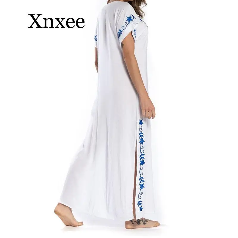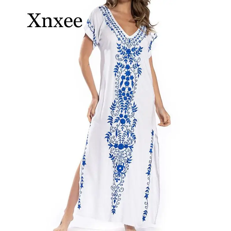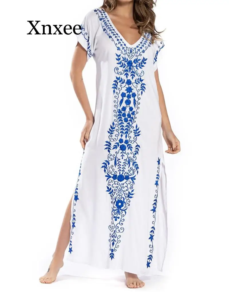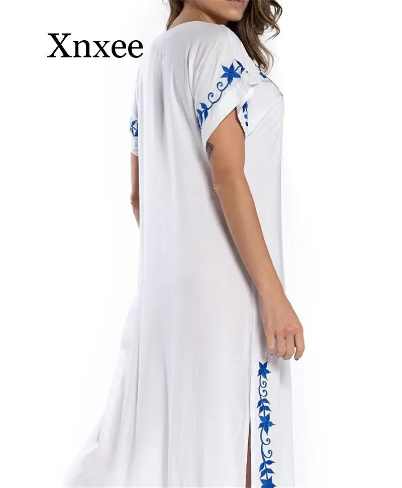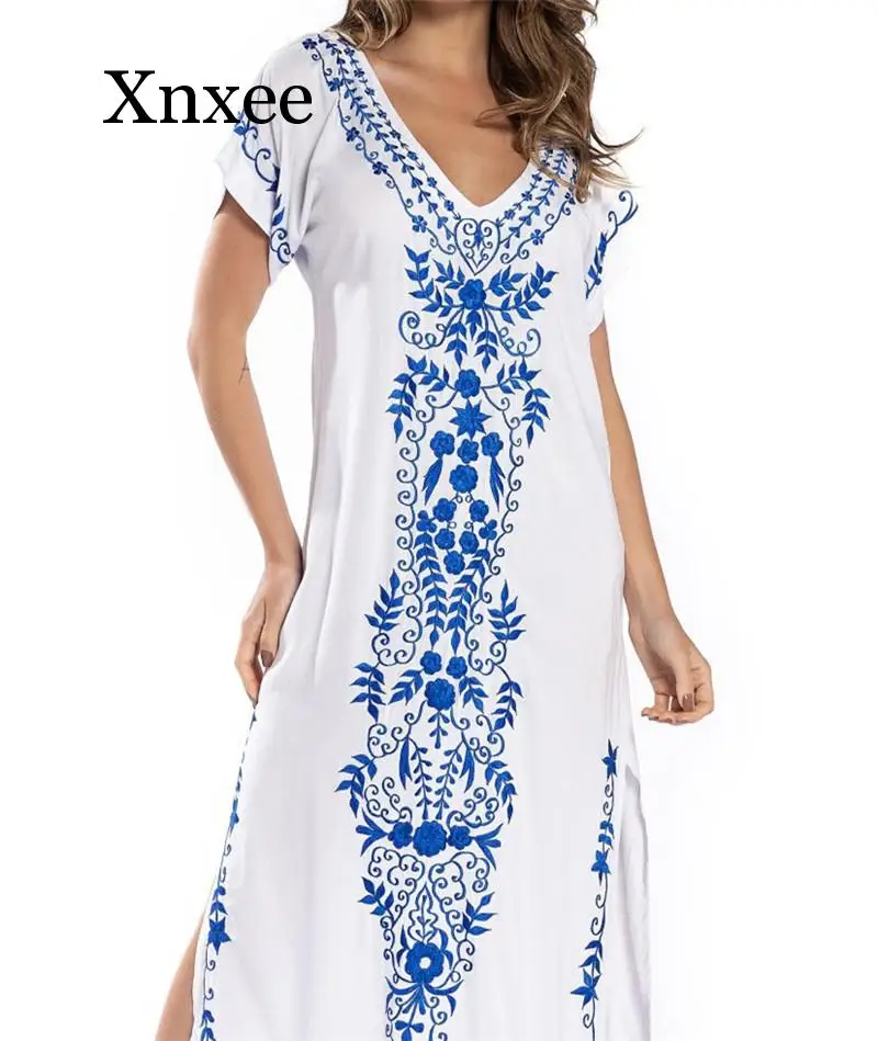 Best Price Comparison With blue boho Embroidery Cotton Beach Cover up Saida de Praia Swimsuit Women Bikini cover up Tunics for Beach Pareo Sarong Beachwear