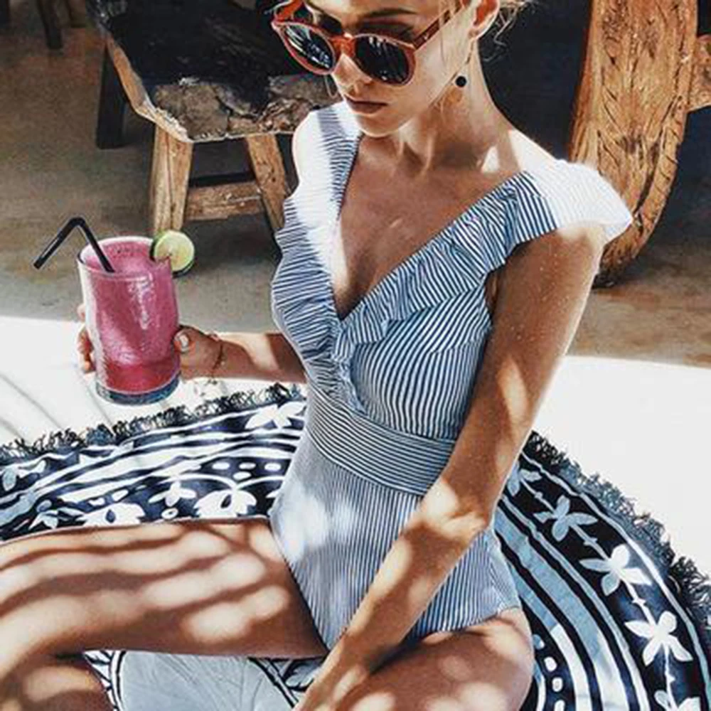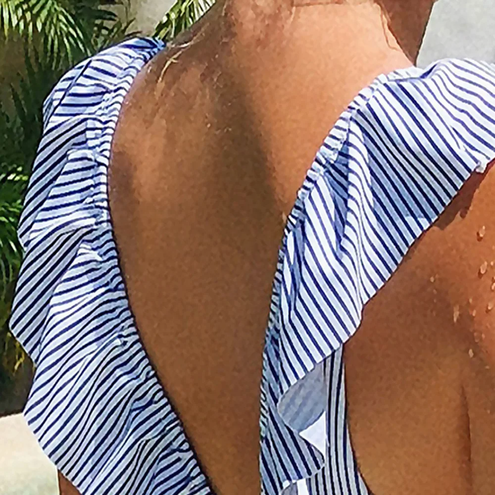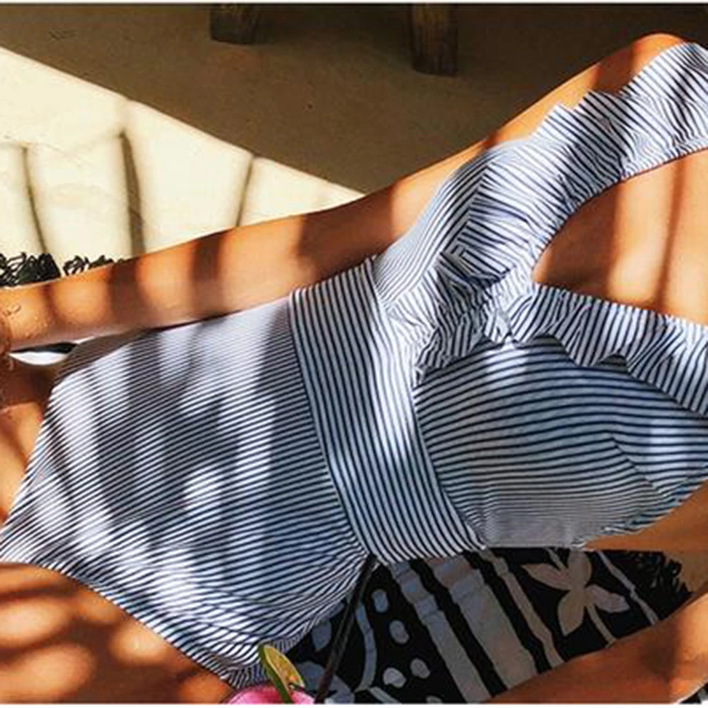 | Sexy Falbala One Piece Swimwear Striped BeachWear 2020 Summer Women Swimming Bathing Suits Hawaii Female Swimsuits Push Up |