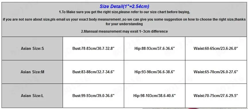 | Asian Size:M | Bust:83-88cm/32.7-34.6" | Hip:93-98cm/36.6-38.6" | Waist:65-70cm/26.0-27.6" |