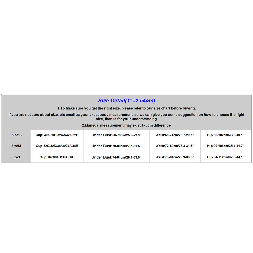 | Size:S | Cup: 30A/30B/32AA/32A/32B | Under Bust:66-76cm/25.9-29.9" | Waist:68-74cm/26.7-29.1" | Hip:86-102cm/33.8-40.1" |