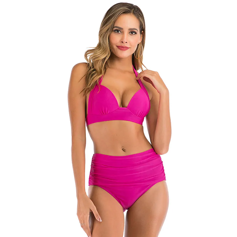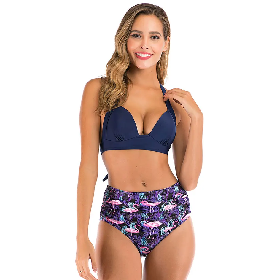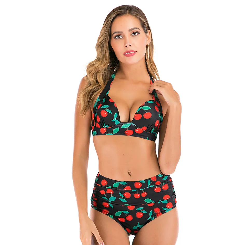 Women Vintage Swimsuit Two Piece Retro Halter Ruched High Waist Print Bikini Set 2020 Summer Hot Sale Push Up Bra Padded