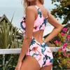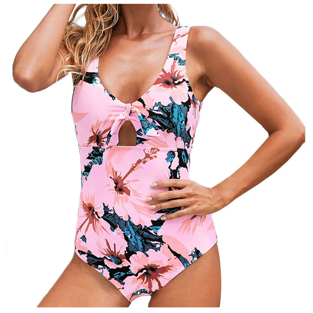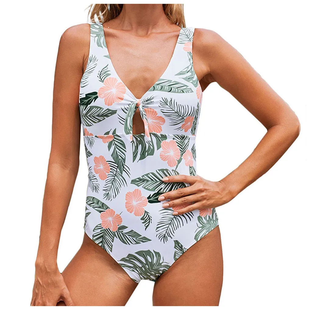 Women Fashion Sexy V-neck Floral Plants Print Backless Suit One Piece Swimsuit